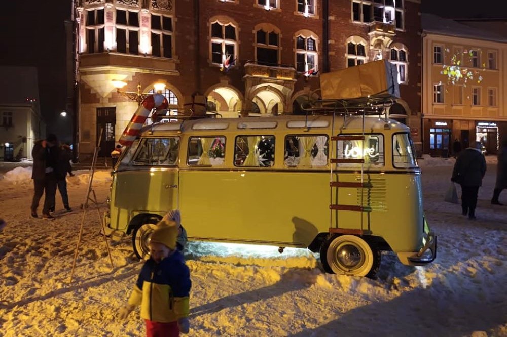 A classic car in the winter time, on a snow-covered market square.